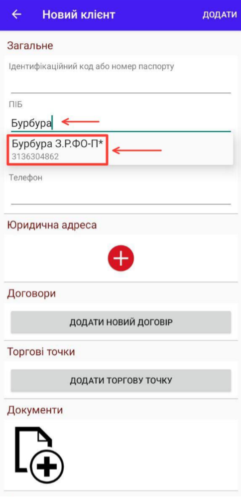 2. В пошук вводимо дані контрагента «ПІБ» та вибираємо контрагента з переліку.