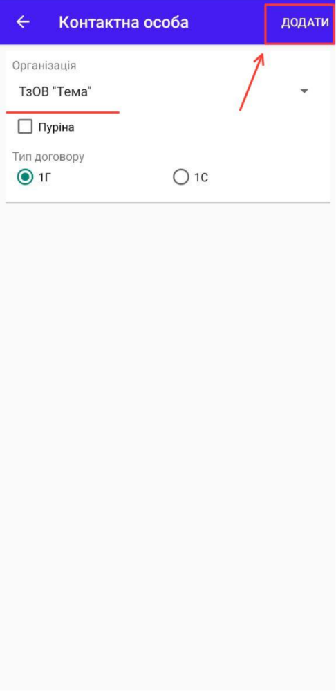 3. Після вибору контрагента з переліку відкрилась картка контрагента з даними. Щоб створити заявку на внесення торгової точки в маршрут потрібно обрати договір, для цього потрібно натиснути на клавішу «ДОДАТИ НОВИЙ ДОГОВІР» та обрати договір по якому потрібно внести контрагента.