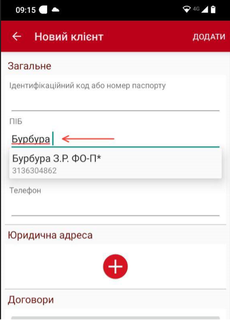 В пошук вводимо дані контрагента «ПІБ» та вибираємо контрагента з переліку.