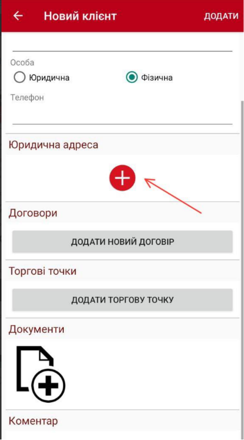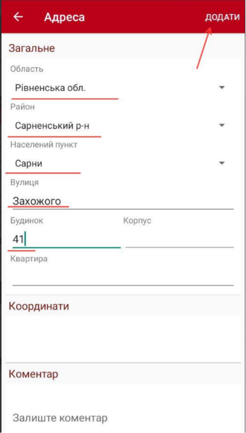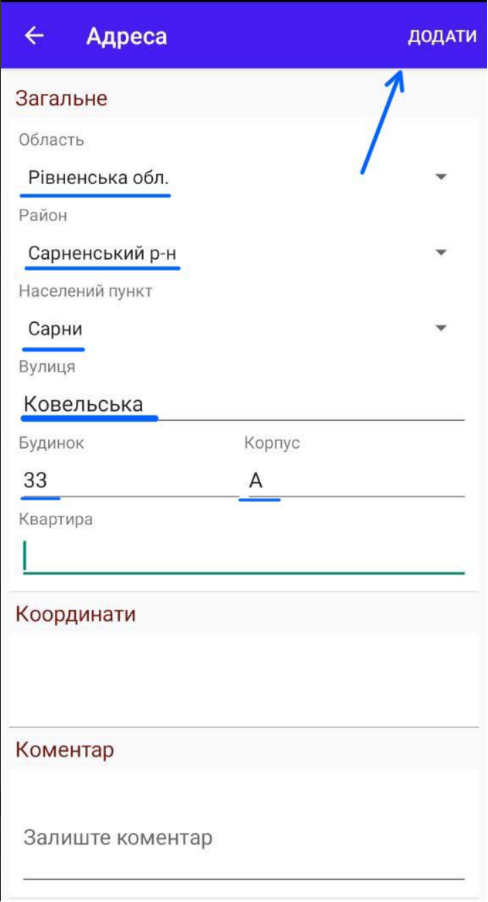 Після заповнити форму «Адреса» та натиснути «ДОДАТИ».