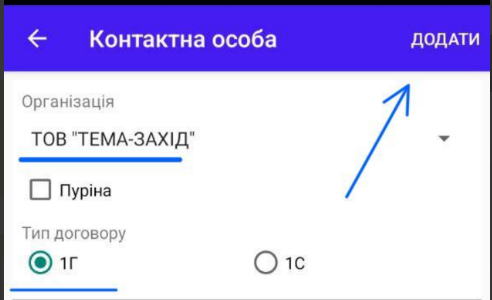 Після внесення юридичної адреси, заповнюємо розділ «Договори» натиснути «Додати новий договір», вибрати організацію, тип договору та натиснути «ДОДАТИ».