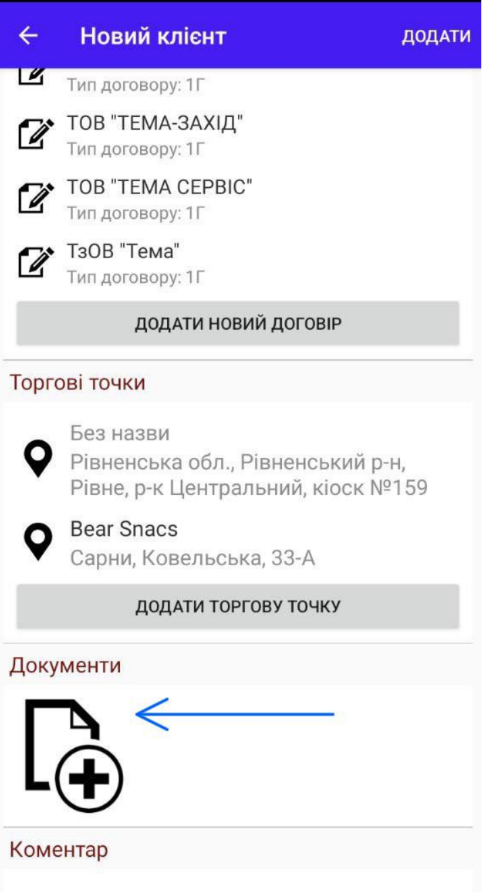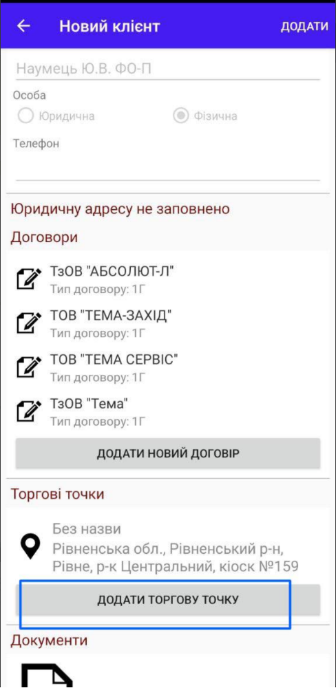 Після внесення нового договору, перейти у розділ «Торгові точки», натиснути «ДОДАТИ ТОРГОВУ ТОЧКУ» і заповнити назву, тип, зону дистрибуції, маркет сегмент, телефон, к-сть касових апаратів та вибрати дні відвідування і перейти до заповнення розділу «Адреса».