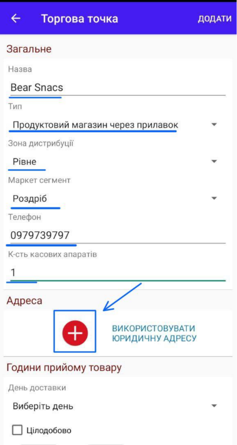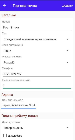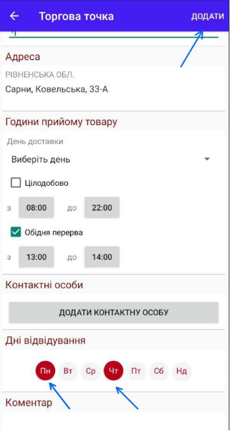 Після створення адреси, повертаємося у розділ «Торгова точка» в якому відображається адреса, яку створено, вибирати дні відвідування, перевірити чи всі поля заповнено та натиснути «ДОДАТИ»