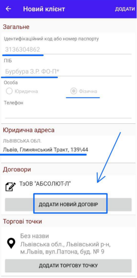 Щоб додати новий договір потрібно натиснути на клавішу «ДОДАТИ НОВИЙ ДОГОВІР»