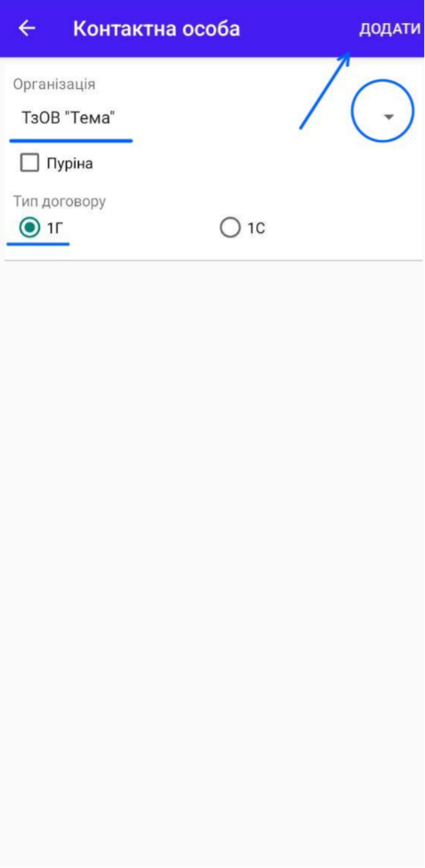 Вибрати організацію по якій потрібно створити новий договір та вибрати тип договору та натиснути клавішу «ДОДАТИ»