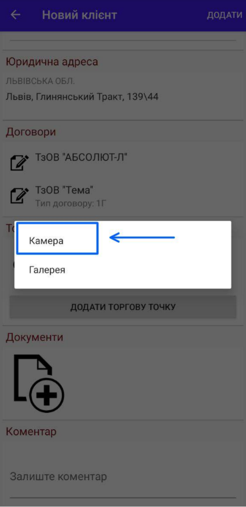 Додати документи можна за допомогою «КАМЕРИ» або «ГАЛЕРЕЇ» телефону. Зробити фото або завантажити вже наявні фото з галереї.